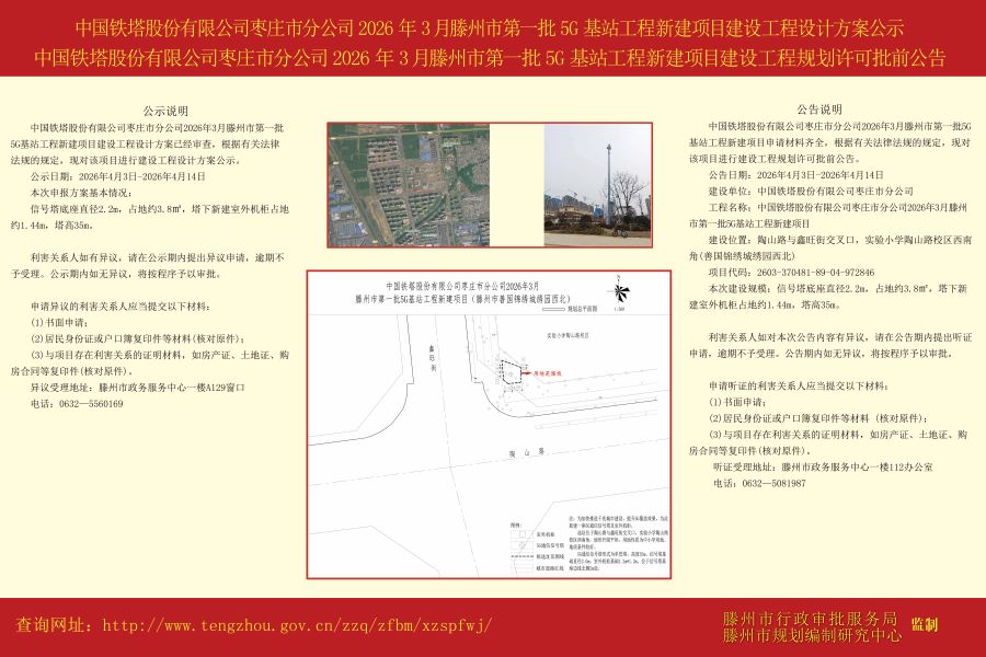 中国铁塔股份有限公司枣庄市分公司2026年3月滕州市第一批5G基站工程新建项目建设工程设计方案公示、中国铁塔股份有限公司枣庄市分公司2026年3月滕州市第一批5G基站工程新建项目建设工程规划许可批前公告.jpg