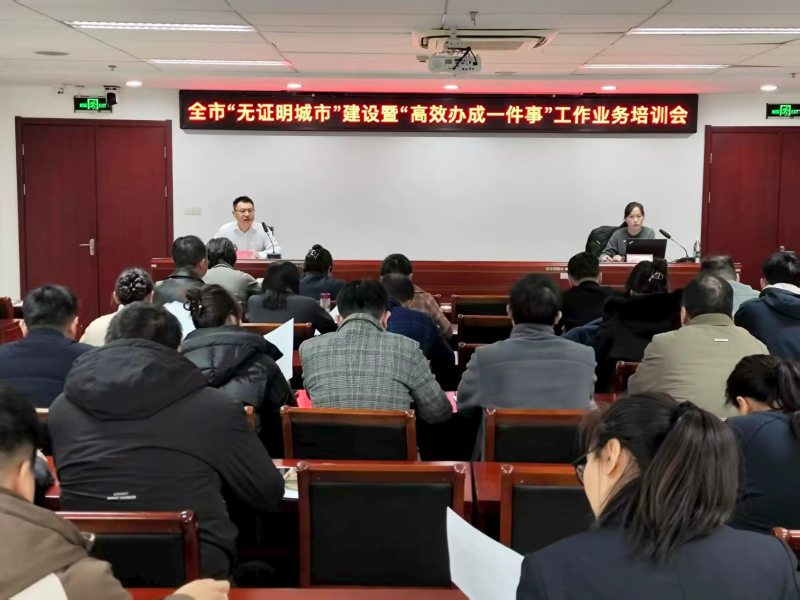 为深化我市“无证明城市”建设,进一步强化电子证照在政务服务领域特别是“高效办成一件事”工作中的应用。12月2日,市行政审批服务局组织召开“无证明城市”建设暨“高效办成一件事”工作业务培训会议,进驻市政务服务中心的部门(单位)首席代表、窗口业务骨干,21个镇街便民服务中心大厅主管、综合窗口工作人员约60人参加会议。