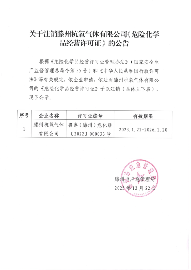 关于注销滕州杭氧气体有限公司《危险化学品经营许可证》的公告
